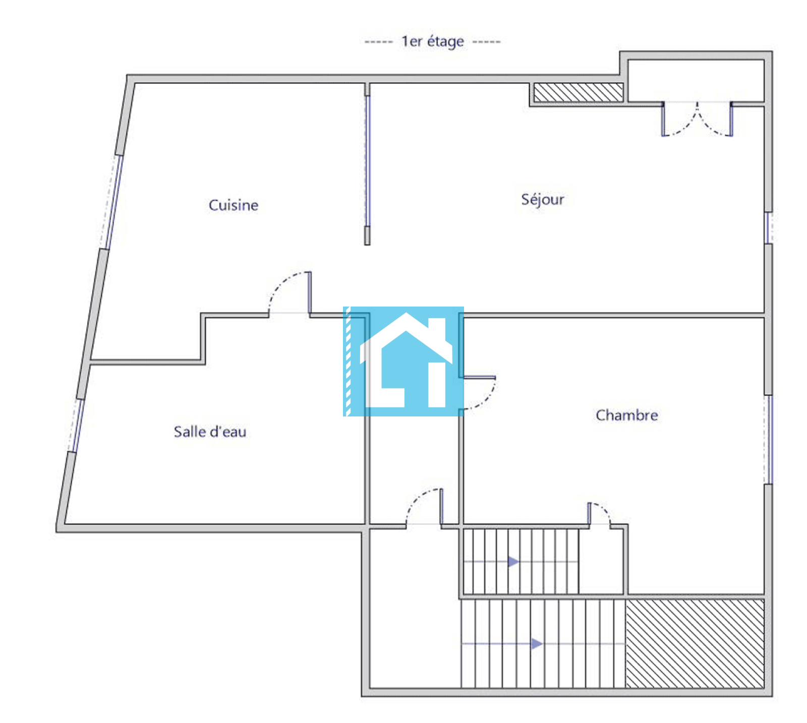 Au 1er étage, deux pièces d'environ 38 m² comprenant : un salon, une cuisine ouverte équipée, une chambre, une salle de bain et un wc.