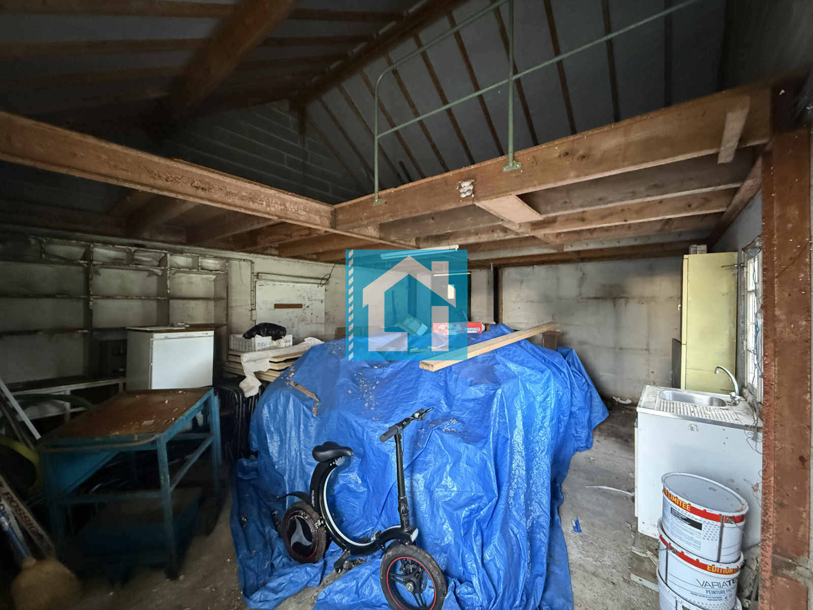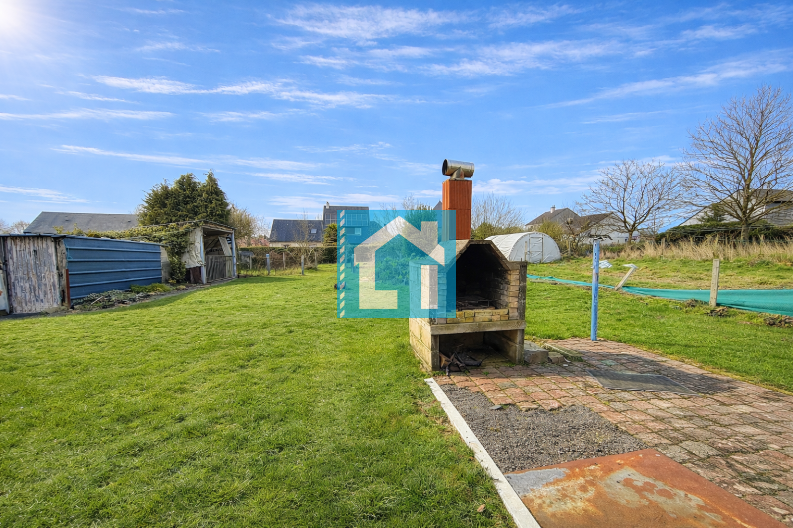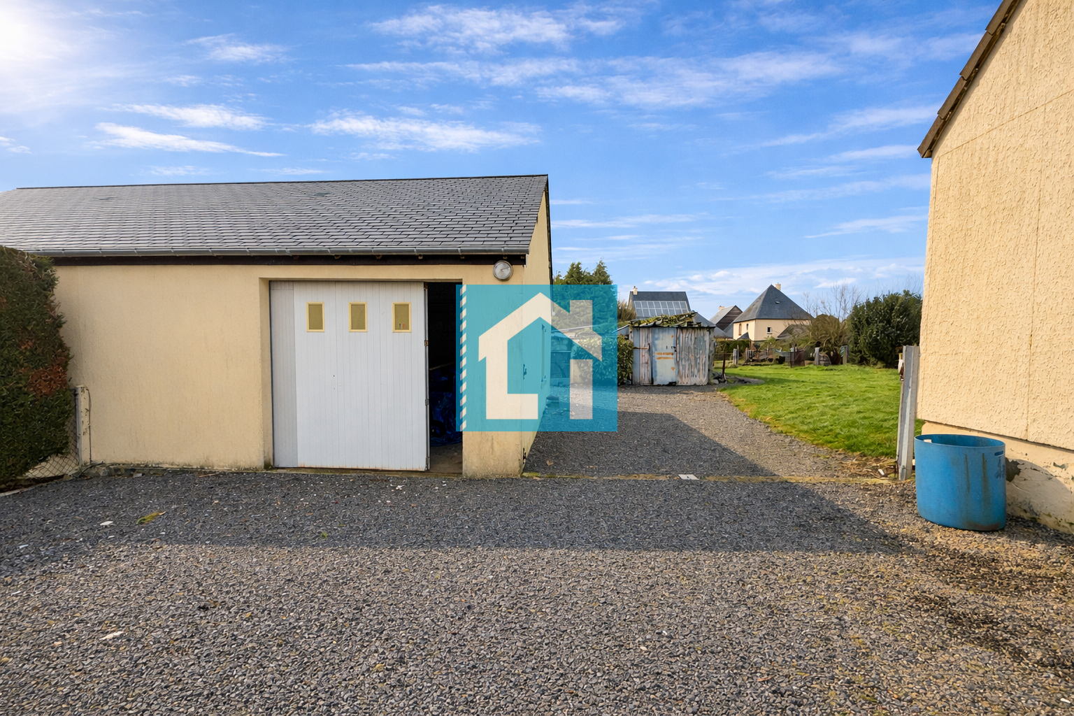 À l'extérieur, le terrain est clos et arboré, offrant un garage indépendant avec grenier d'environ 35 m² et plusieurs petites dépendances démontables.
