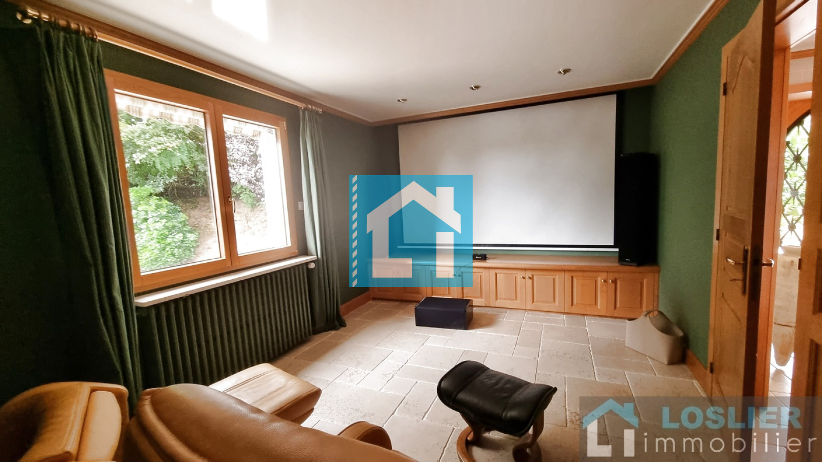 Dès l’entrée, le rez-de-chaussée dévoile une salle de cinéma privée, un bureau baigné de lumière plein Sud, une cuisine aménagée et équipée, ainsi qu’un vaste salon-séjour avec cheminée à foyer ouvert.