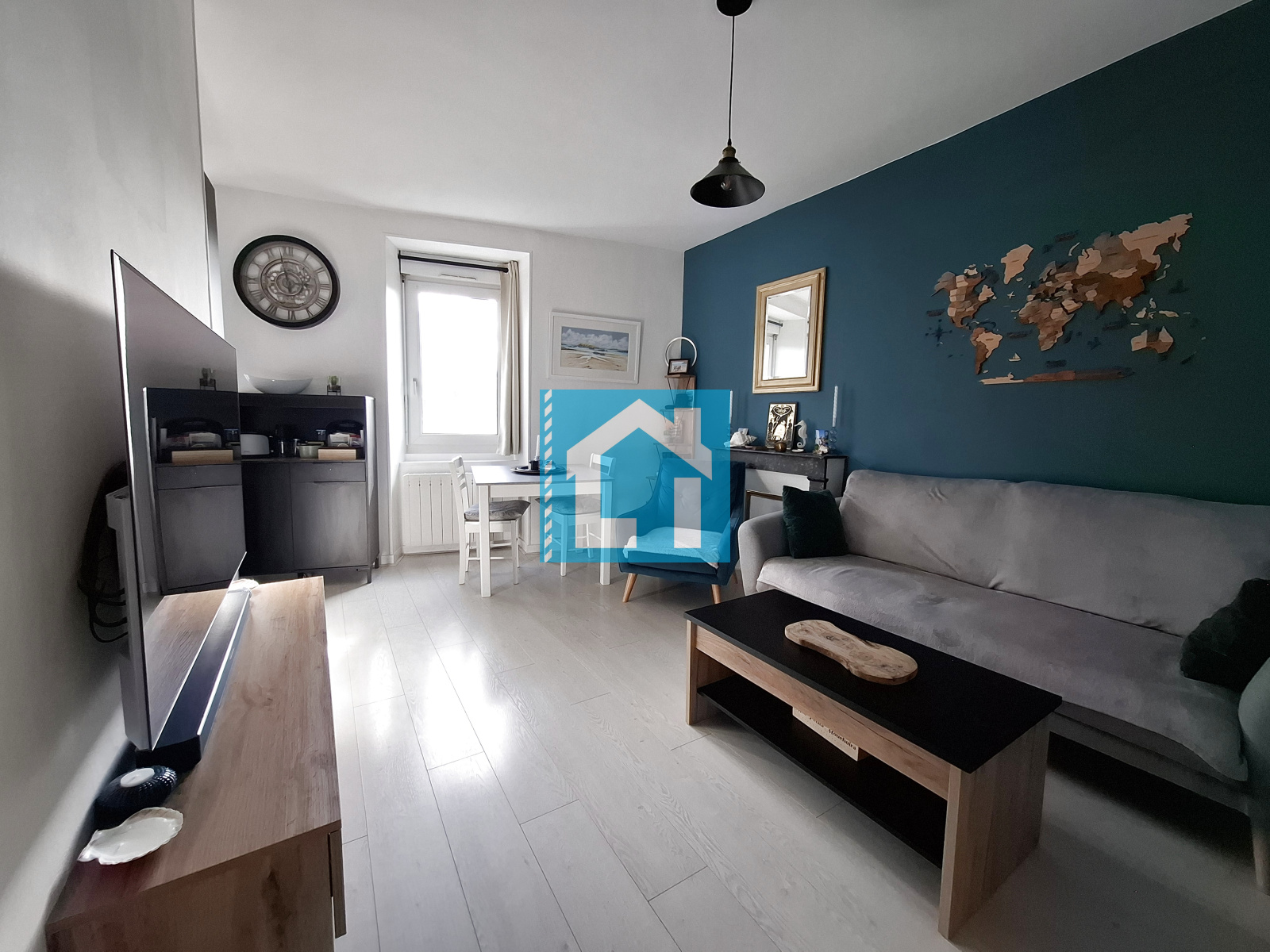 Une pièce de vie lumineuse ouverte sur la cuisine aménagée et équipée, une chambre, un bureau, une salle d'eau et un WC indépendant.