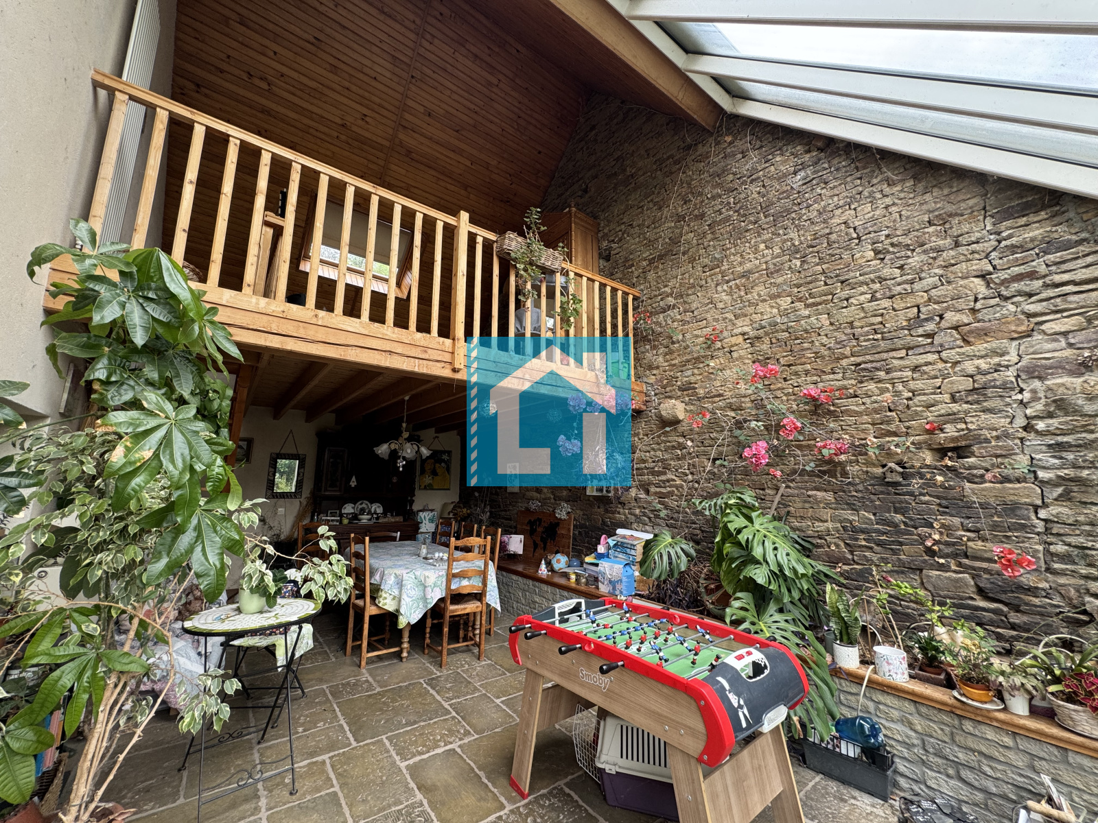 Constituée au RDC d'une véranda avec sa mezzanine, une buanderie, une cuisine et d'un salon avec cheminée en pierre.