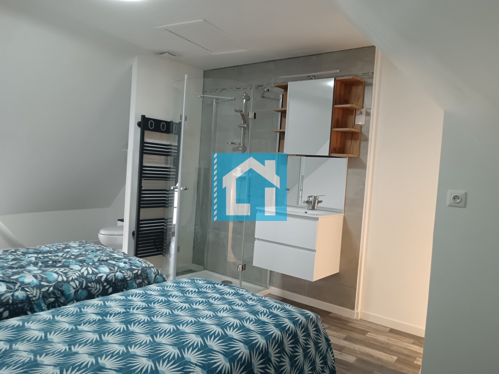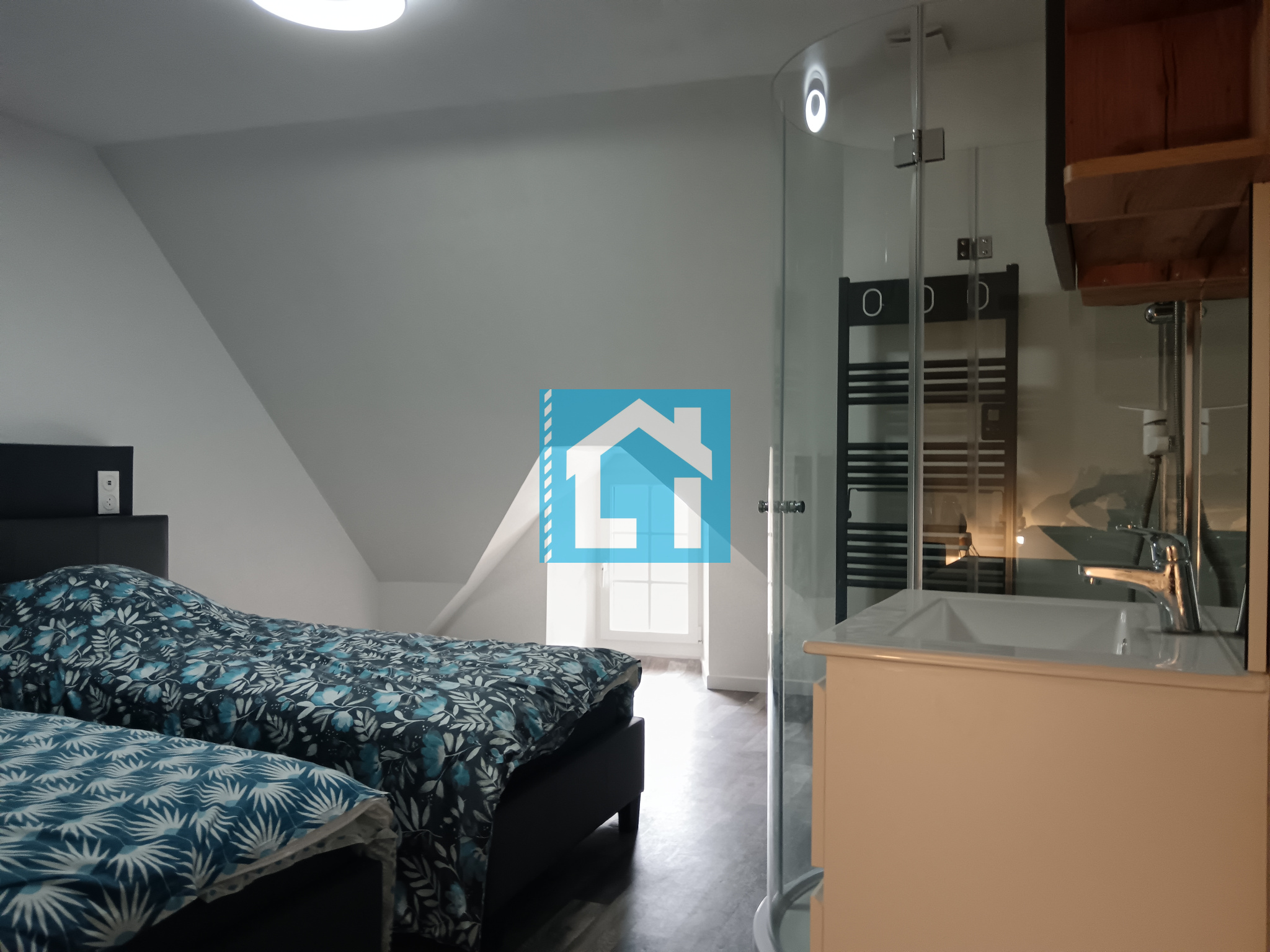 Au dernier étage dans une pièce mansardée, la seconde chambre de cette maison de ville équipée d'une douche, lavabo et WC.