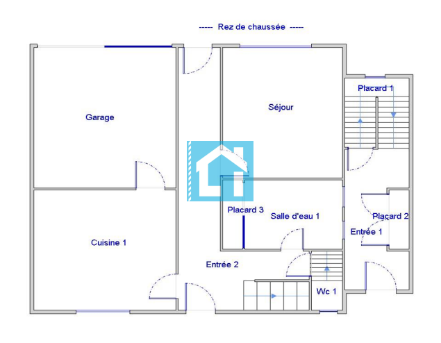 Rez-de-chaussée : Entrée, cuisine, salle d'eau, WC, arrière-cuisine et garage.