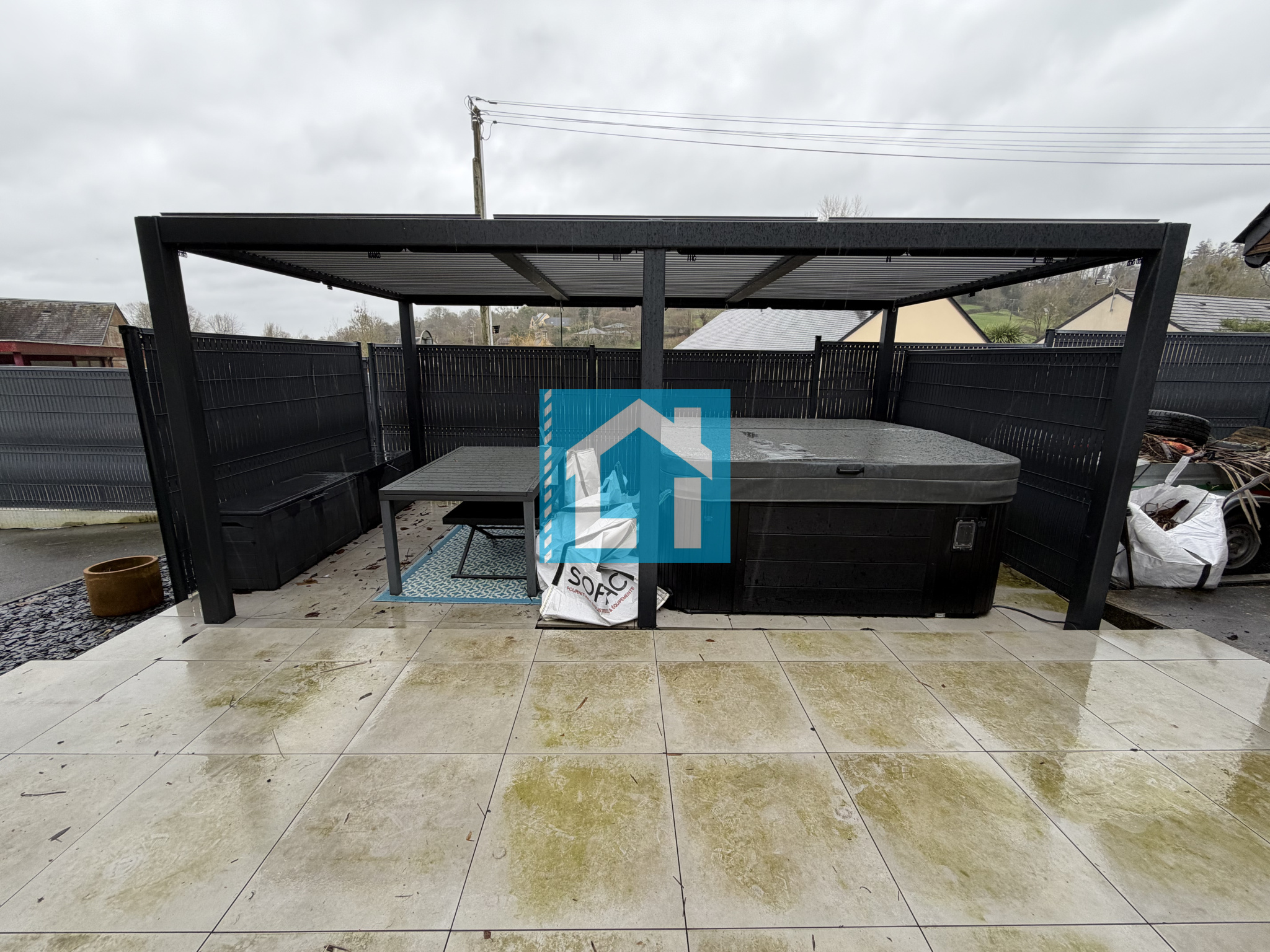 À l'extérieur, cette propriété de 1240 m² dispose d'un jardin avec son abri, d'une terrasse avec pergola aisni qu'un grand jacuzzi idéal pour se relaxer après une journée de travail. La cour est entièrement bitumée.